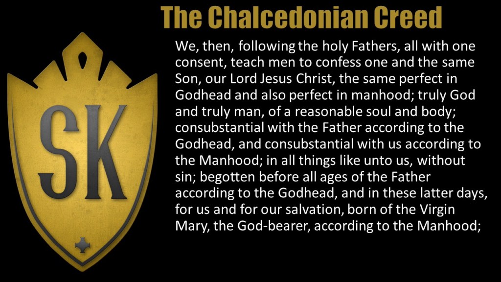 We, them, following the holy Father, all with one consent, teach men to confess one and the same Son, our Lord Jesus Christ, the same perfect in Godhead and also perfect in manhood; both completely god and completely man in body and soul. Of the same essence as the Father according to the Godhead, and of the same essence as us according to the Manhood; in all things like unto us, without sin; begotten before all ages of the Father according to the Godhead, and in these latter days, for us and for our salvation, born of the Virgin Mary, the God-bearer, according to the Manhood;